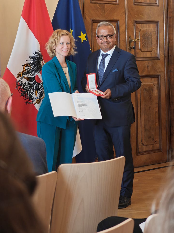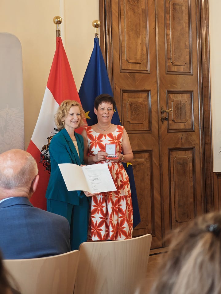 My friend and role model Dr. Andy Kaltenbrunner received a decoration of honor (“Goldene Ehrenzeichen für Verdienste um die Republik Österreich”) and was so kind to take me with him. It was my first time in the newly occupied building for the ministry of research (Minoritenplatz 3, no longer Minoritenplatz 5) and also the first time that I saw the new minister of research Eva-Maria Holzleitner live. Head of Unit Elmar Pichl was the laudator. Brigitte Kromp (see Weekly 19/2024 and Weekly 21/2025) received an award as well.
